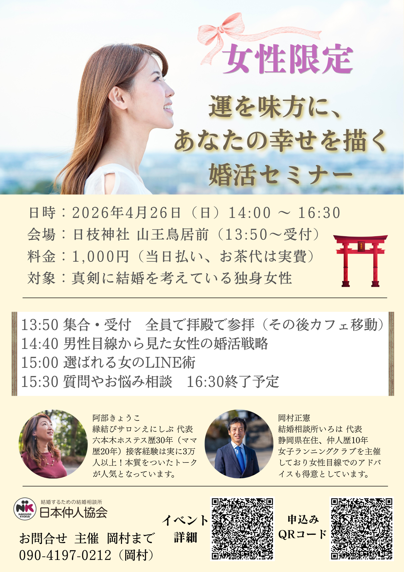 阿部からは、明日からすぐ使える「選ばれる女のLINE術」を。そして、一緒に登壇する男性仲人の岡村からは、ズバリ「男性目線から見た婚活戦略」をお話しします。男心の本音、知っておいて絶対に損はありません。
